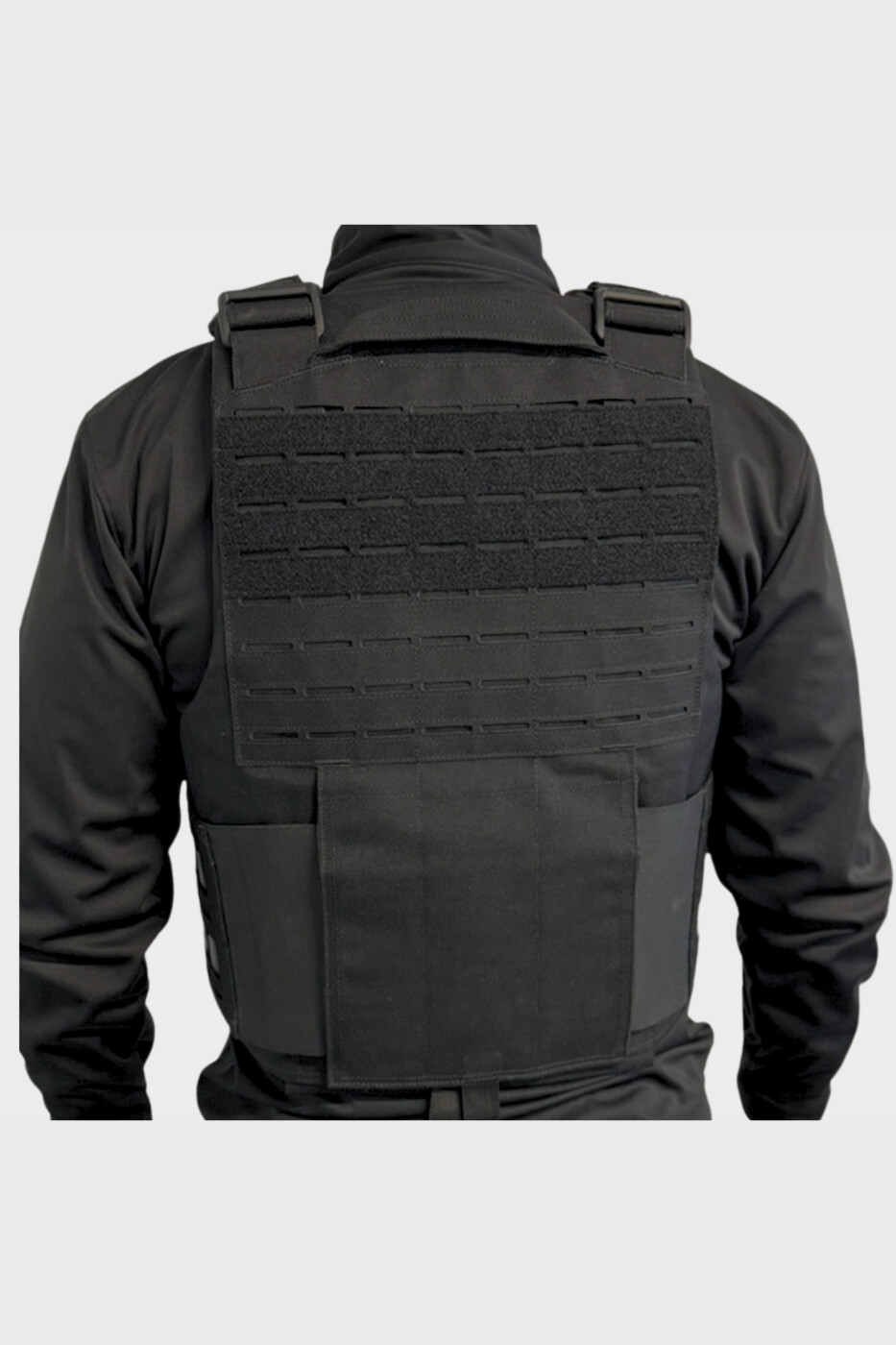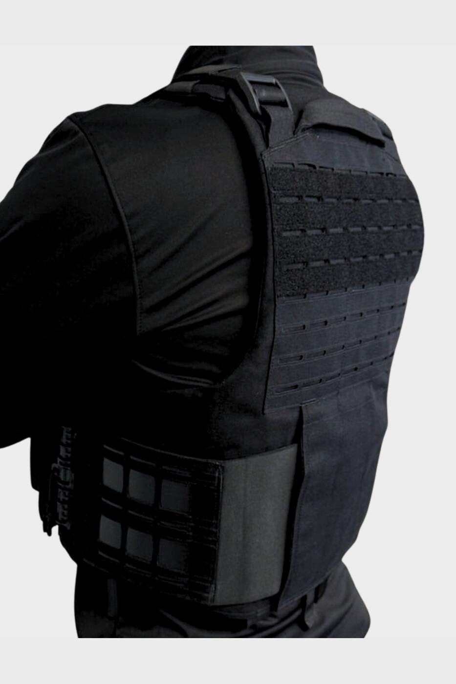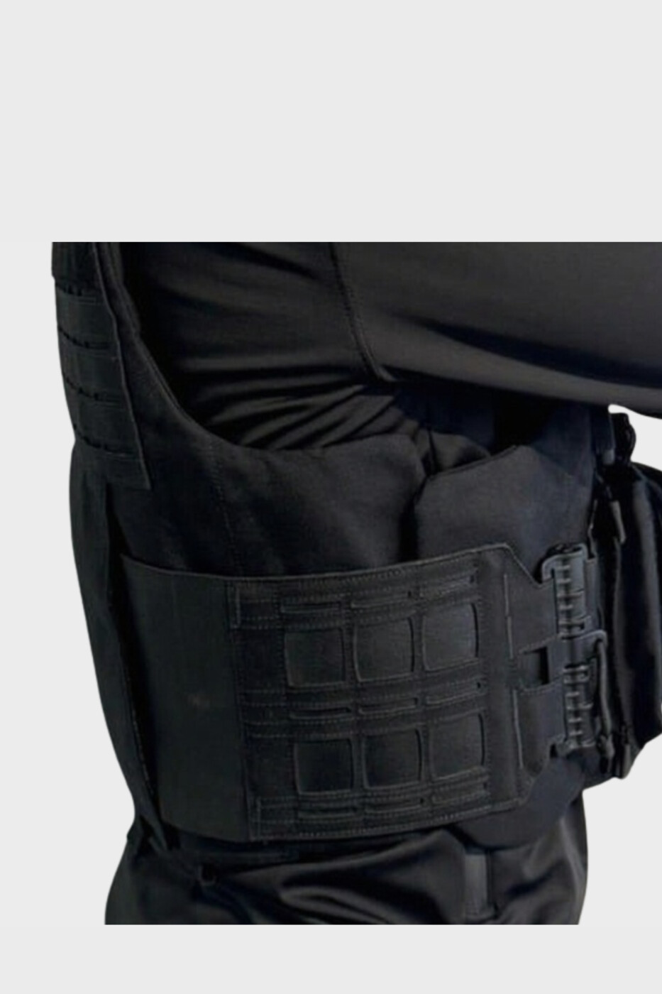 Système Quick Release – passants MOLLE – poignée d’évacuation – jeu de ventipads velcro – cummerbunds élastiques ajourés